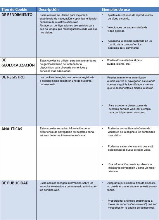 Debe tener en cuenta que, si el usuario elimina o bloquea todas las cookies de este sitio web, es posible que parte de este no funcione correctamente o la calidad de la página web pueda verse afectada.